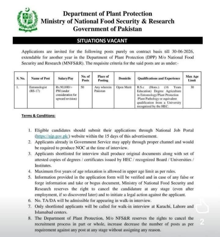 Department of Plant Protection Jobs کے تحت وزارتِ نیشنل فوڈ سیکیورٹی میں اینٹومولوجسٹ کی 50 نئی آسامیوں کا اعلان کر دیا گیا ہے۔ 90 ہزار روپے ماہانہ تنخواہ، اہلیت کے معیار اور نیشنل جاب پورٹل پر آن لائن اپلائی کرنے کی مکمل تفصیلات یہاں جانیں۔